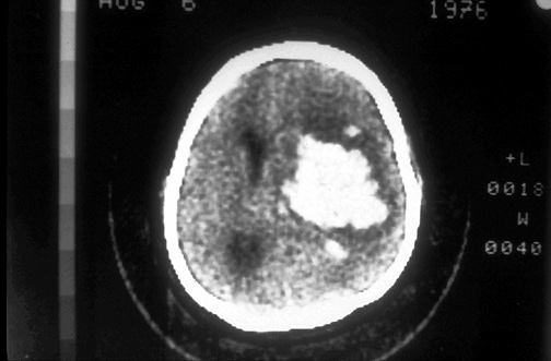 This computed tomographic (CT) scan of the head in transverse view demonstrates an area of hemorrhage in a patient with a history of hypertension.
