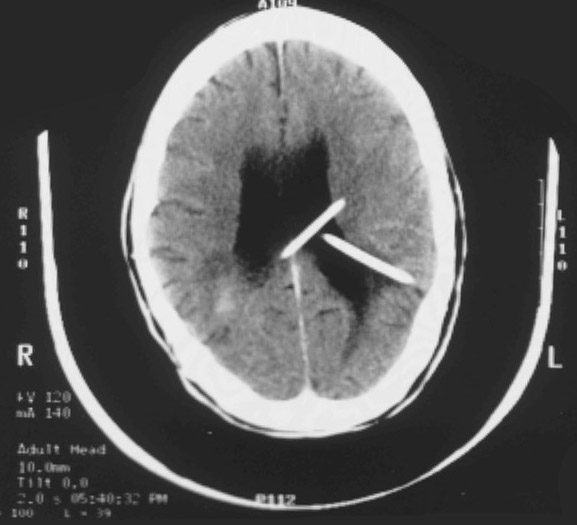 This is a computed tomographic (CT) scan demonstrating enlarged lateral ventricles in a patient with hydrocephalus. This condition has been treated by placing two shunts (the thin white objects).