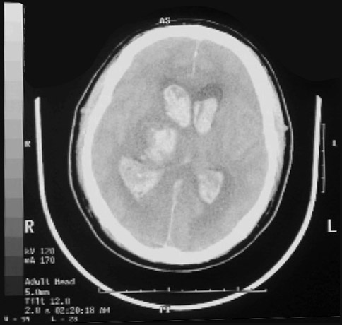 This is a computed tomographic (CT) scan demonstrating a hypertensive hemorrhage in the right thalamus that has extended into the ventricular system. Hemorrhages in this location are not amenable to surgical intervention with removal of the blood.