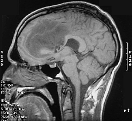 This is a sagittal MRI scan demonstrating a large glioma impinging upon the ventricular system. A transverse view is shown below