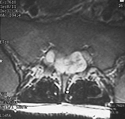 This magnetic resonance imaging (MRI) scan in sagittal view demonstrates a lobulated mass extending down from the level of L4. This is a myxopapillary ependymoma, the most common neoplasm at this site, and a common place for an ependymoma.