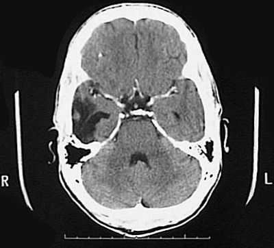 This CT scan demonstrates a large area of hemorrhage in the right temporal lobe as a consequence of a ruptured vascular malformation.